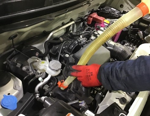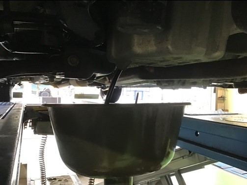 車両をリフトアップさせ、古いエンジンオイルを