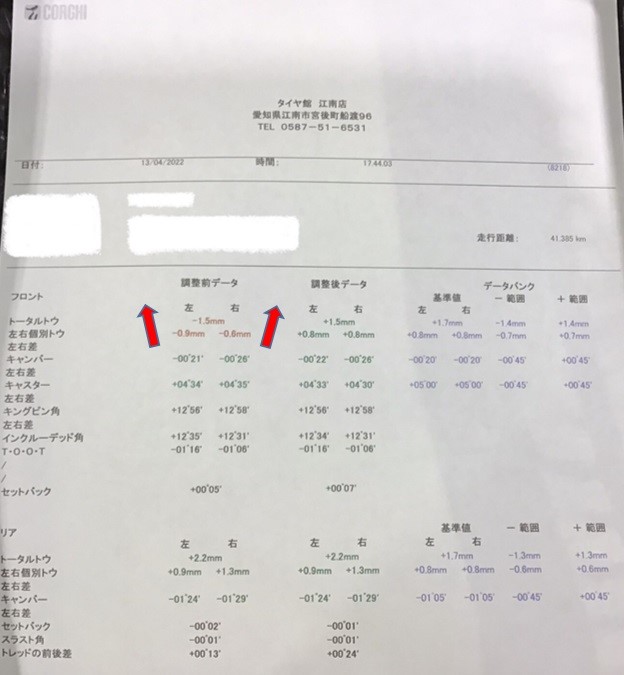 少し見にくいですが、左右前輪の角度が基準値からずれていました(゜o゜)