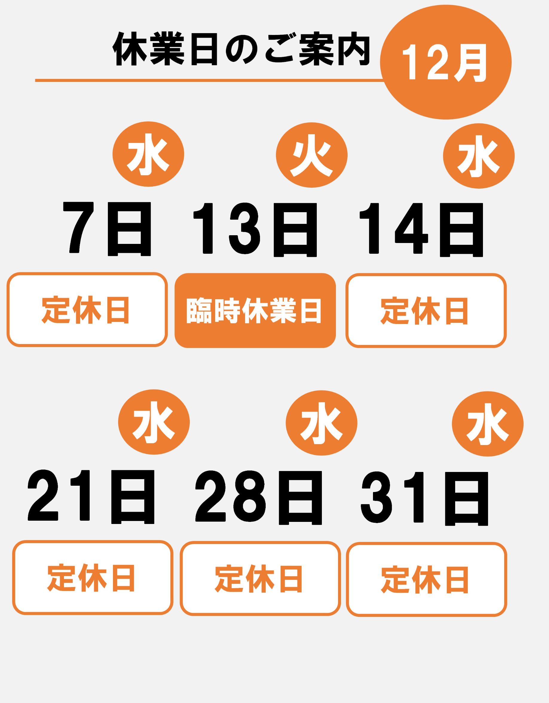 12月の定休日のお知らせ ポスト 2022年12月1日 こんにちは タイヤ館江南です(^^♪ 12月の店休日のお知らせです! 7日(水) 13日(火) 14日(水) 21日(水) 28日(水) 31日(土) 大変ご迷惑をおかけしますが、宜しくお願いいたします。 カテゴリ:お知らせ