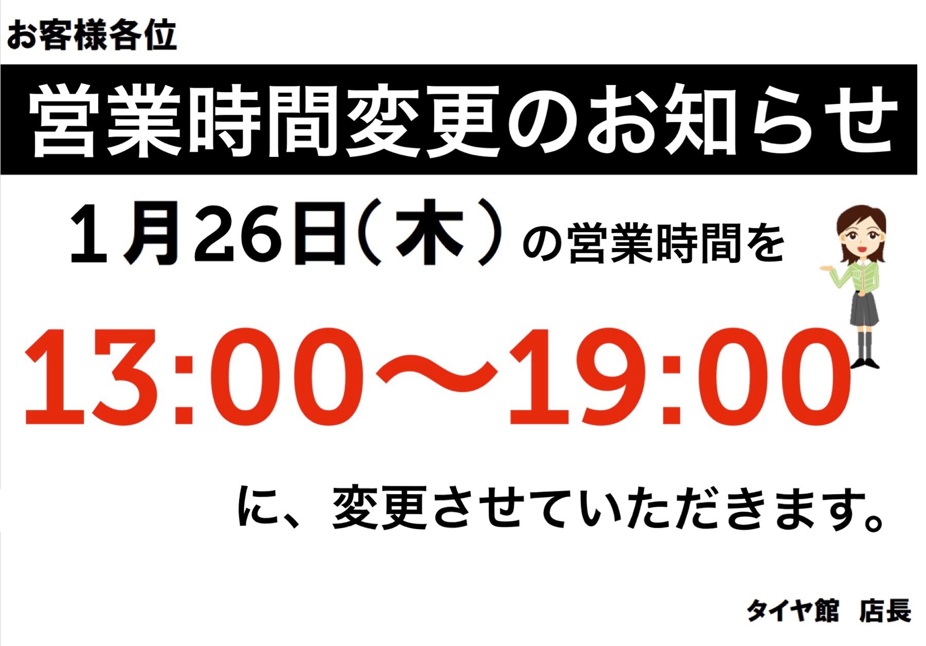2023/1/26(木)の営業時間案内 ポスト 2023年1月15日 いつもタイヤ館江南店をご利用いただき誠にありがとうございます。 営業時間変更のご案内をさせていただきます。 1月26日(木) 13:00〜19:00 1/26は午後からの営業となります。宜しくお願い致します。 カテゴリ:お知らせ