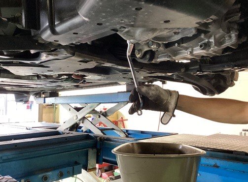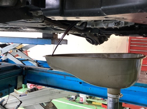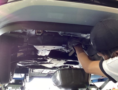 車両をリフトアップさせ、古いエンジンオイルを