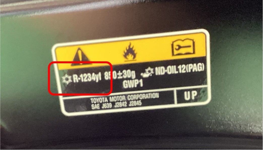 まずはボンネットを開けて、このクルマがR1234yfガスで合っているのか確認します。