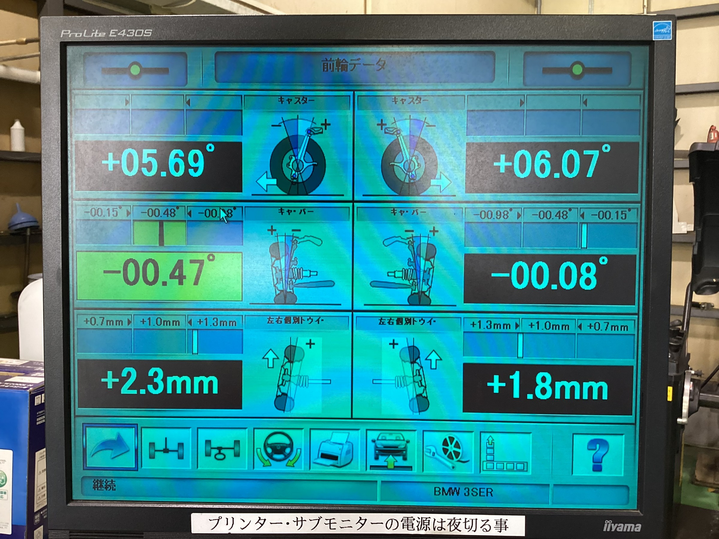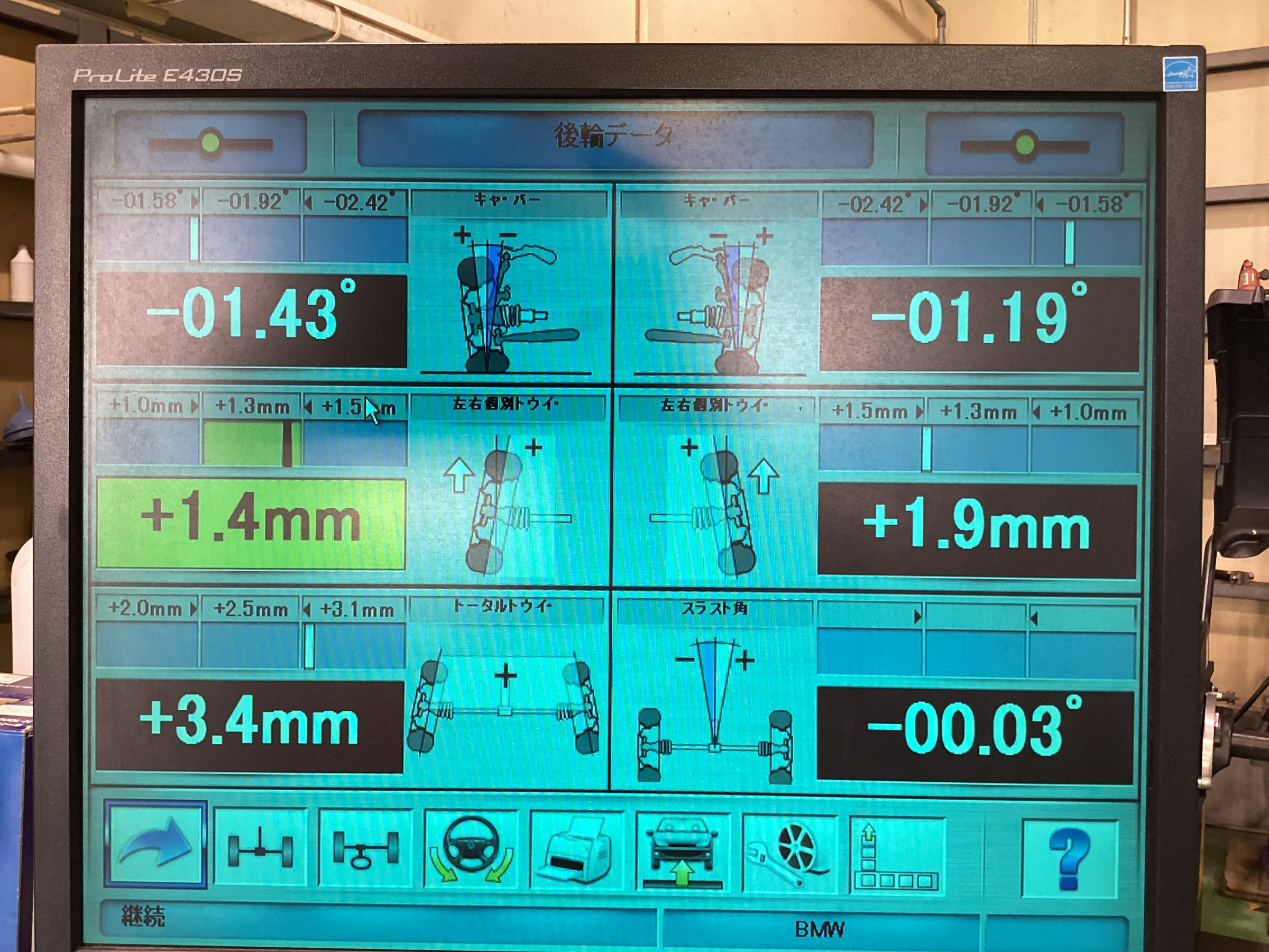 前輪後輪とも基準値からズレていましたので、この後しっかりと基準値に調整致しました。
