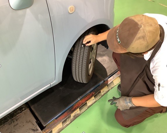 空気圧・残りミゾ・偏摩耗・ひび割れ・4輪の減り方のばらつき等点検させていただきます。