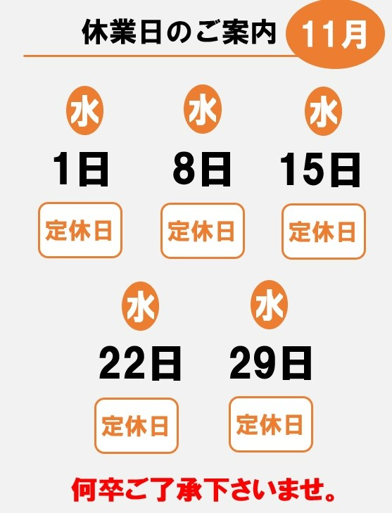 2023年11月の定休日のご案内 ポスト 2023年10月31日 当店のホームページをご覧いただき誠に有難う御座います。 2023年11月の店休日のご案内となります。 何卒ご理解ご協力の程宜しくお願い致します。 カテゴリ:お知らせ
