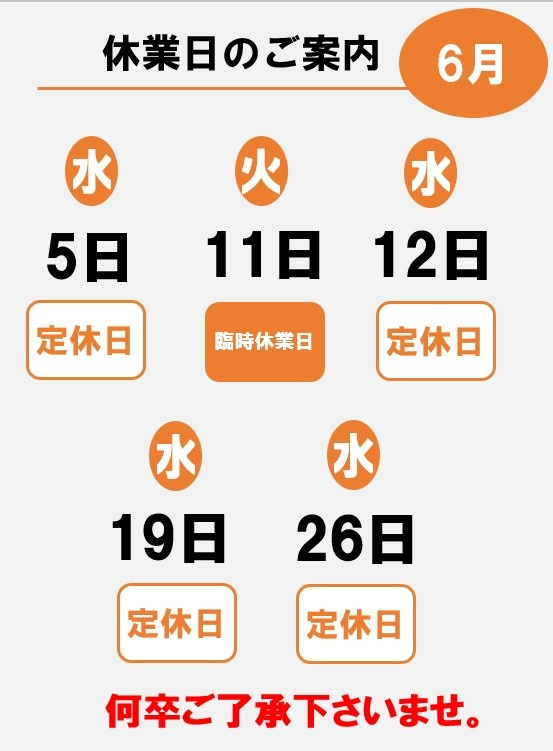 2024年6月の店休日のご案内 ポスト 2024年5月24日 当店のホームページをご覧いただき誠に有難う御座います。 2024年6月の店休日のご案内となります。 何卒ご理解ご協力の程宜しくお願い致します。 カテゴリ:お知らせ