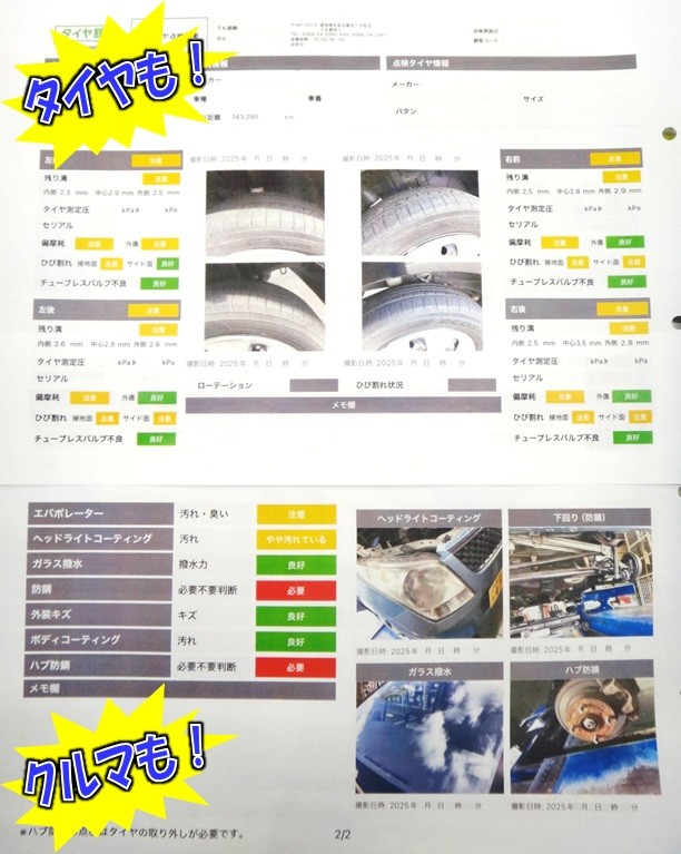 タイヤやクルマに関する「点検」の文字。