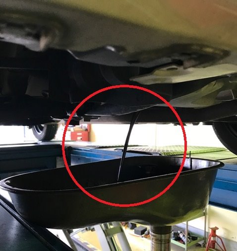 写真はエンジンオイル交換の作業でオイルを抜いているところです。