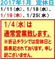 1月定休日のお知らせ ポスト 2016年12月26日 1月 営業日・定休日のお知らせです!2017年は1月3日(火)から営業します。 11日(水)、18日(水)、19日(木)、25日(水)を定休日とさせていただきます。 4日(水)は通常営業致しますので、よろしくお願い致します。※一部チラシに「4日(水)は定休日」と誤表記されております。ご迷惑をお掛けし申し訳ございません。2016年は大変お世話になりました。2017年もどうぞよろしくお願い致します。 カテゴリ:お知らせ