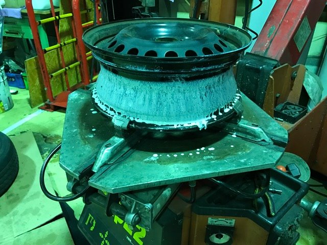 このように、白い修理剤がタイヤ内部に広がっていて