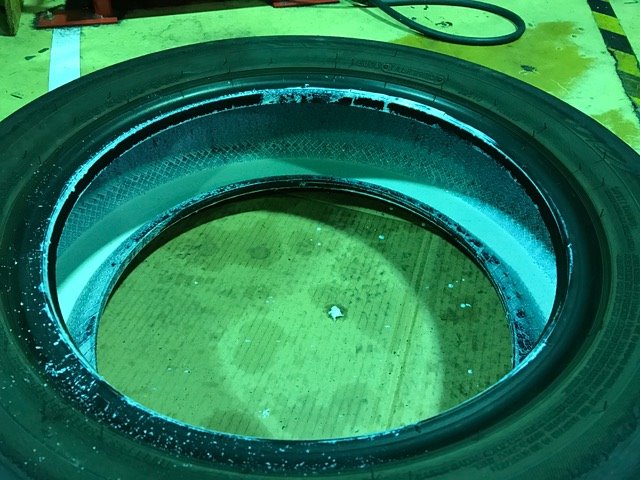 こちらが、パンク修理剤で応急処置をしたタイヤの内部です。