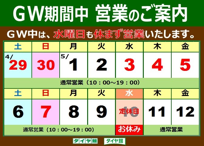 GWは休まず営業♪ ポスト 2017年4月27日 タイヤ館江南です。 GWは水曜日も休まず営業致します! お出かけ前には空気圧点検・お車の無料日常点検にお立ち寄りくださいませ! ご来店お待ちしております。 カテゴリ:お知らせ