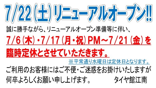 ※リニューアル準備等により、7/17(月・祝)13時~7/21(金)を臨時休業とさせていただきます。