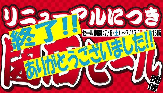 リニューアルに伴う閉店セールは、7/17(月・祝)の13時をもって終了いたしました。