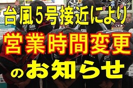 ※台風5号接近による営業時間変更のお知らせ※ ポスト 2017年8月7日 いつも当店をご利用いただき誠にありがとうございます。 台風5号接近により、本日7日(月)の営業を 16:00 までとさせていただきます。 なお、明日8日(火)の営業に関しまして、 今後の台風の状況により営業開始時間が平常より遅れる可能性がございます。 ご利用のお客様には、ご不便・ご迷惑をお掛け致しますが、何卒ご理解の程よろしくお願い申し上げます。 タイヤ館 江南 カテゴリ:お知らせ