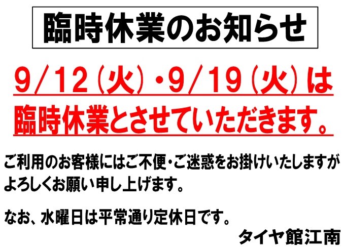 9月 定休日・臨時休業日のお知らせ ポスト 2017年8月31日 9月 定休日・臨時休業日のお知らせです。 毎週水曜 ( 9/6(水)・9/13(水)・9/20(水)・9/27(水) )は 定休日です。 その他、9/12(火)・9/19(火)は臨時休業とさせていただきます。 ご利用のお客様にはご不便・ご迷惑をお掛け致しますが、よろしくお願い致します。 カテゴリ:お知らせ