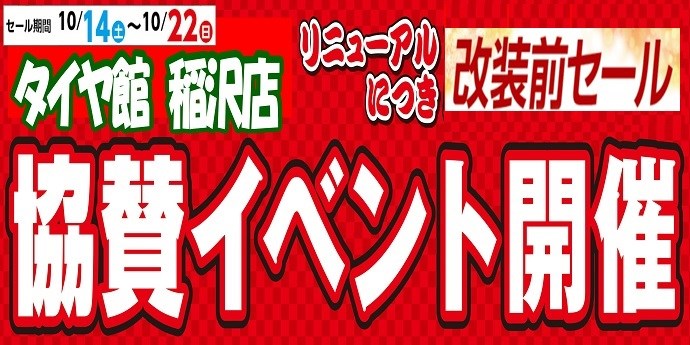 ☆売り出しまであと2日☆ ポスト 2017年10月12日 こんにちは!タイヤ館江南店です。 暑くなったり涼しくなったり気温の変化が激しいですね>< 体調など崩されないようお気を付け下さいね。^^ タイヤ館稲沢店が、10/28(土)・10/29(日)にリニューアルオープンを控えています! 当店でも、稲沢店リニューアルに伴う「改装前セール」協賛売り出しを開催♪♪ 夏・冬タイヤを検討されている方 一度話だけでも聞きに来てくださいね!! 期間は10/14(土)~10/22(日)です!ぜひぜひご来店ください!! お待ちしております!!^^ カテゴリ:お知らせ