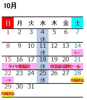 10月予定!! ポスト 2017年10月14日 こんにちは!タイヤ館江南店です。 既に10月も中旬・・・少し遅くなってしまいましたが、今後の予定をカレンダーにまとめました^^; ご来店の際は参考になさってください!! 10/28(土)・10/29(日)は稲沢店のリニューアルオープン日でもありますが 当店では「「夏・冬タイヤ大商談会」」開催いたします!! タイヤご成約のお客様にプレゼントをご用意予定です♪♪ ご来店をお待ちしております。 カテゴリ:お知らせ
