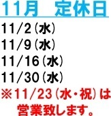 11月 定休日のお知らせ ポスト 2016年11月1日 11月定休日のお知らせです!11月は2日(水)、9日(水)16日(水)、30日(水) を定休日とさせていただきます。なお、23日(水・祝日)は営業致しますので、よろしくお願い致します。 カテゴリ:お知らせ