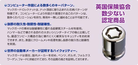 盗難防止にはやっぱりコレ!マックガード。 ポスト 愛車のタイヤ・ホイールを盗難から守るにはコレ! “≪マックガード≫” 普通のロックナットとは違い、コンピューター作図による キーパターンの為、専用キー無しに緩める事は不可能です。 また、錆びにくく抜群の耐久性です。 ナンバープレートの盗難防止用も出ました。 よろしかったらタイヤ・ホイールとともにいかがですか? カテゴリ:商品情報 ホイール関連