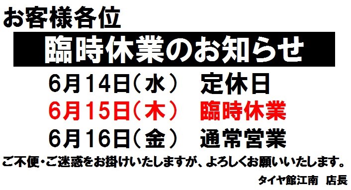 臨時休業のお知らせです。 6月15日(木)は臨時休業とさせていただきます。 (その他、水曜日が定休日となります。) ご不便・ご迷惑をお掛けし申し訳ございませんが よろしくお願い申し上げます。 タイヤ館江南(TEL:0587-51-6531)