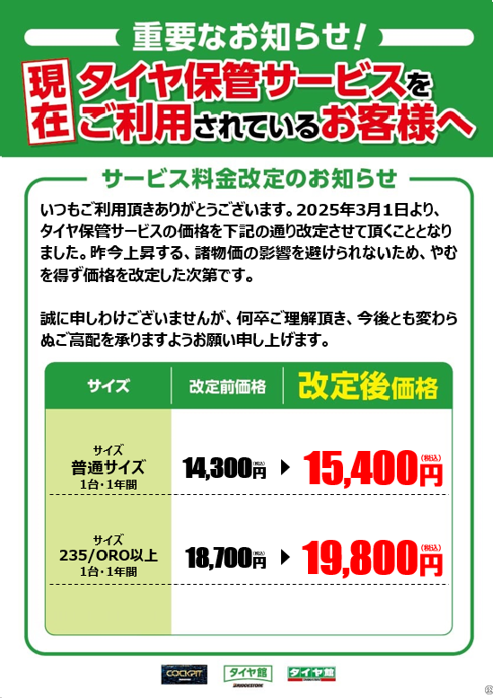 タイヤクローク料金 更新のお知らせ タイヤ保管サービス【タイヤ館郡山】 ポスト 2025年1月16日 いつもタイヤ館郡山をご利用頂きありがとうございます。 現在タイヤ保管サービスをご利用されているお客様へ、 下記の通りご案内させて頂きます。 誠に申し訳ございませんが、何卒宜しくお願い申し上げます。 タイヤ館 郡山 住所:963-0205福島県郡山市堤3-13 電話番号: 024-961-9800 相談予約 カテゴリ:お知らせ その他商品・サービス タイヤ関連 担当:渡部