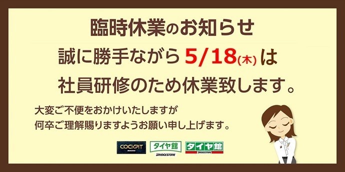 福島エリア全店舗5/18(木)は臨時休業になります。