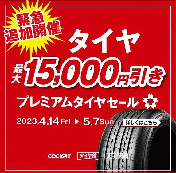 ゴールデンウィークも休まず営業しております!!プレミアムタイヤセール タイヤクーポン最大15,000円引き!! 5月7日(日)まで♪【タイヤ館郡山北】