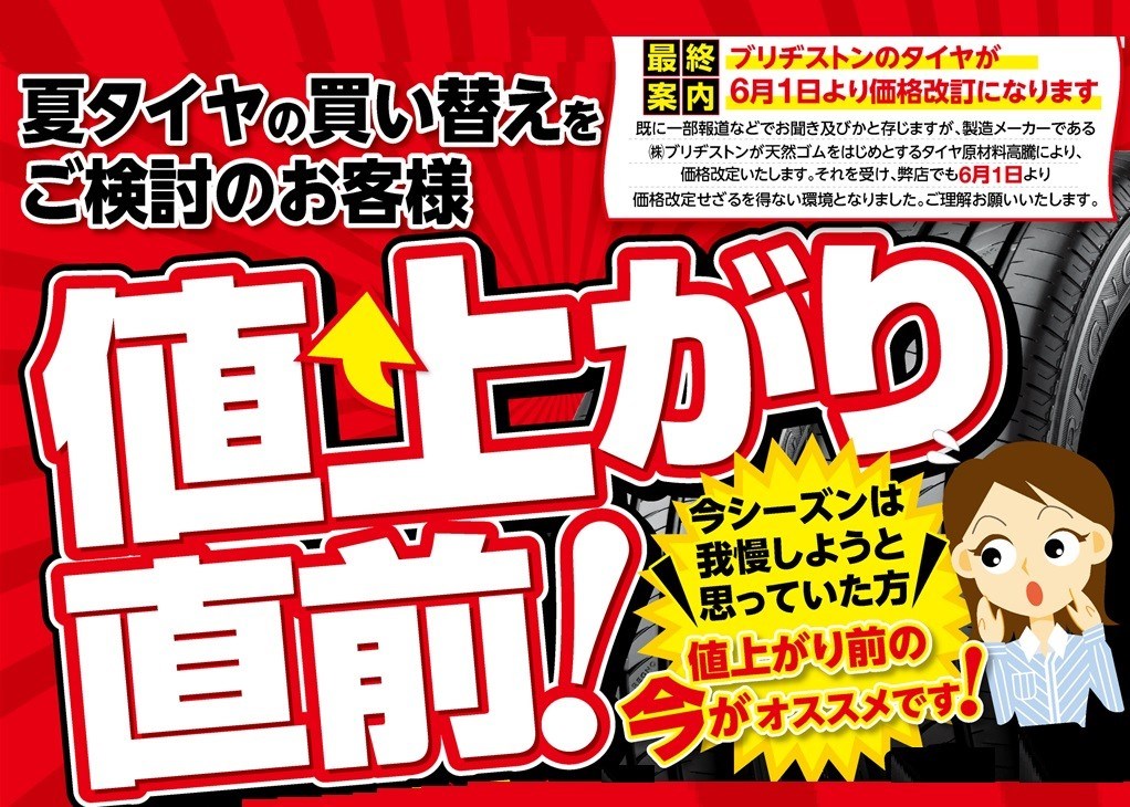 6/1よりタイヤが値上げとなりますので購入検討させているお客様5月中がお得です!!