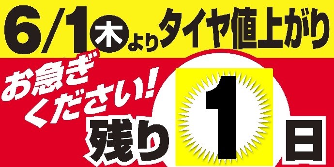 いよいよ明日6/1よりタイヤ値上げとなりますので、本日までがお買得です!!