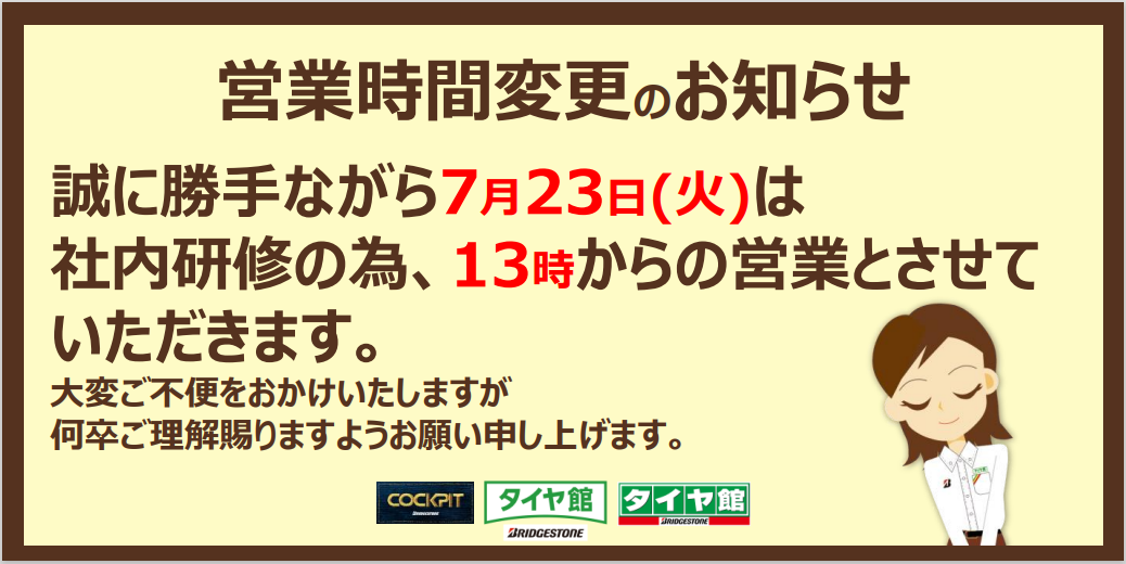 本日の営業時間のご案内 ポスト 2024年7月23日 本日は社内研修の為、営業時間が変更となります。 ご不便をおかけしますが、ご理解賜りますようお願い申し上げます。 タイヤ館 こせ 住所:400-0851山梨県甲府市住吉4丁目23-5 電話番号: 055-224-1115 相談予約