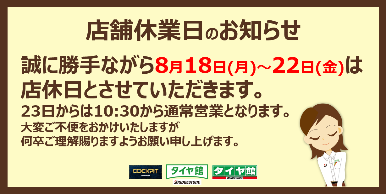 店舗休業日のお知らせ ポスト 2025年8月17日 8月18日(月)~8月22日(金)は店休日となります。 大変ご不便をおかけいたしますが 何卒ご理解賜りますようお願い申し上げます。 タイヤ館 こせ 住所:400-0851山梨県甲府市住吉4丁目23-5 電話番号: 055-224-1115 担当:白井
