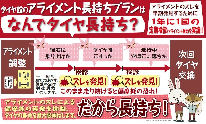 アライメント長持ちプランのご案内! ポスト タイヤを購入頂いたお客様にアライメントの測定を最大4年間無料でおこないます! タイヤ購入後、縁石への乗り上げ等でアライメントがズレテしまっても最大4年間 測定を致します! カテゴリ:商品情報 その他商品・サービス