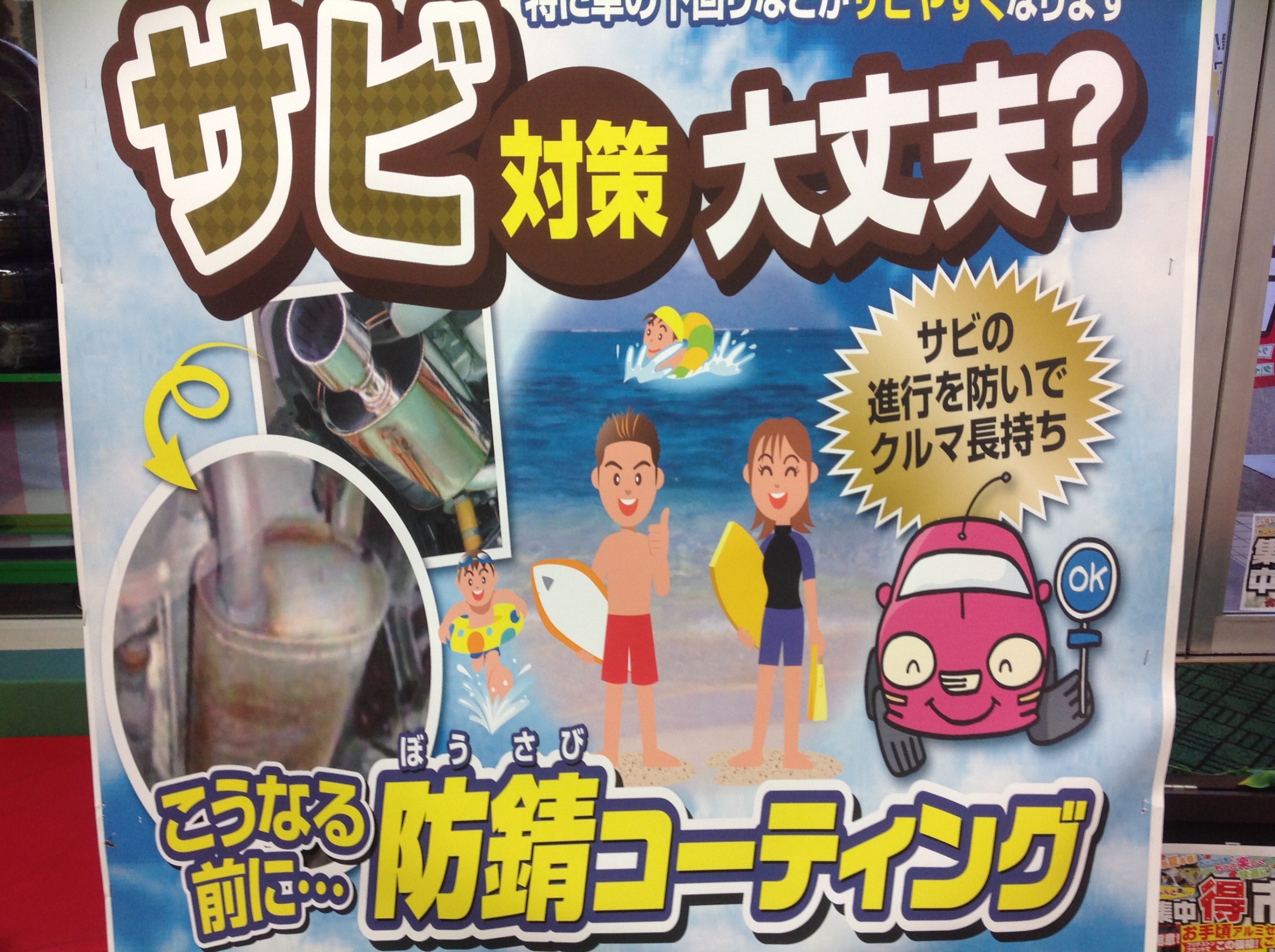 防錆コーティング! ポスト 2017年7月22日 本日のブログ担当星野です☆ お車の下回りのコーティングはしていますか? コーティングをせずに乗り続けていると錆が進行してしまい、 特にマフラーが穴が開いてしまうことがあるんです! 当店では防錆コーティングを実施中! 下回りの点検も無料で行っていますので、ぜひお気軽にどうぞ! 担当:星野