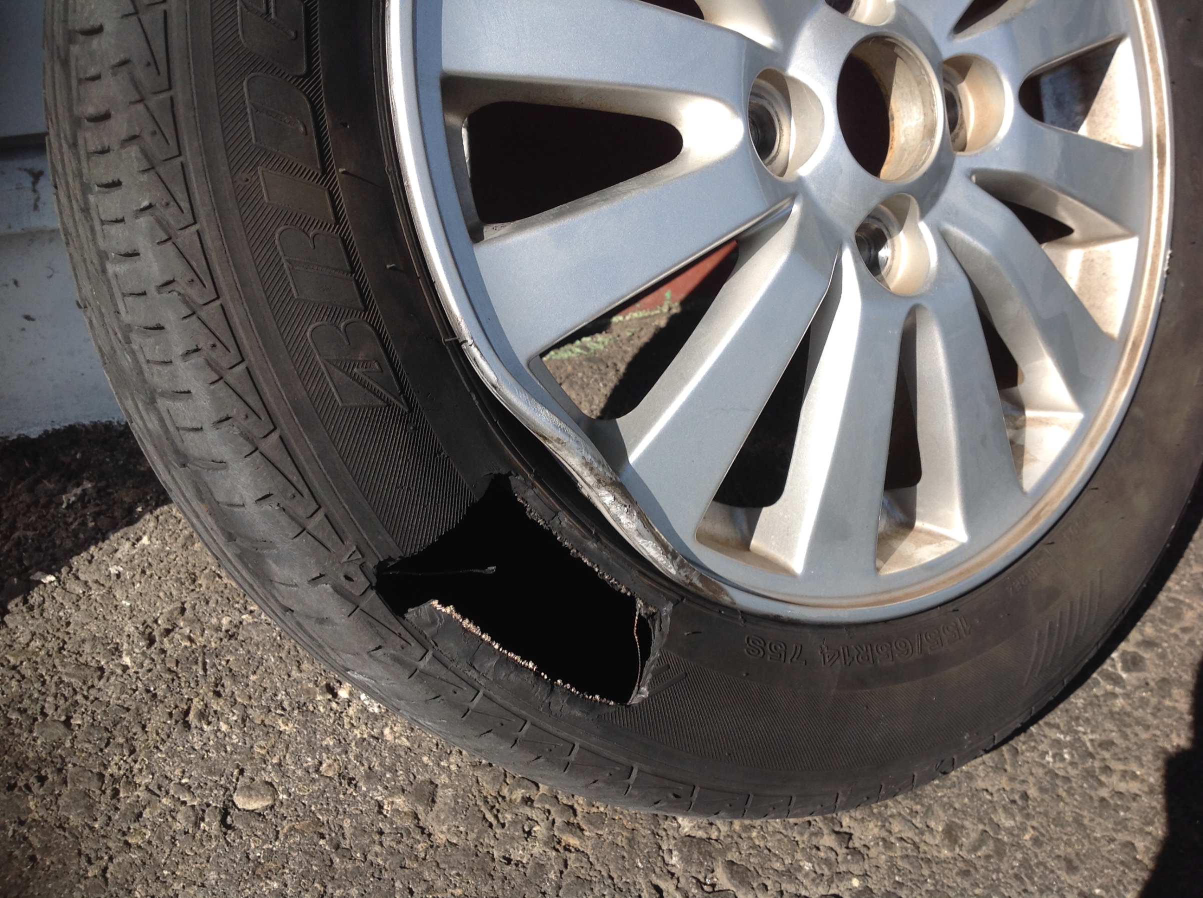 タイヤに穴が ポスト 2017年8月24日 皆さん、こんにちは タイヤ館こせ店の 磯です 今回は、タイヤにポッカリと穴が空いているタイヤです。 お客様曰く、道路に石が落ちていて 避けきれずに、踏んでしまったみたいです。 結果、ホイールまで曲げてしまい タイヤも使えない状態に みなさんも、道路になにが落ちているか判りませんの 気を付けて、車の運転をしてください。 担当:磯