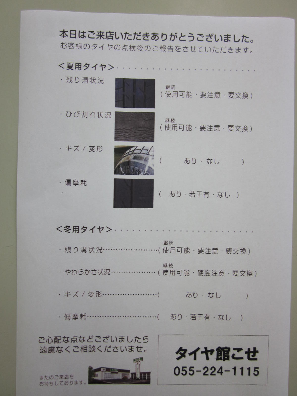 ☆タイヤ点検☆ ポスト 2018年4月11日 おはようございます。 タイヤ点検大好き四條です。 みなさん、夏タイヤへの履き替えは終わりましたか? 当店でもお客様のクルマの履き替えが毎日続いてます。 タイヤ館では履き替え時に夏、冬タイヤの点検を行ってます。 今後安心してタイヤをお使い頂けるかプロの目で チェックしてます! 履き替えは是非当店で♪ ただ今大変混み合っておりますので 予約サービスをご利用ください。 055-224-1115 まで。。