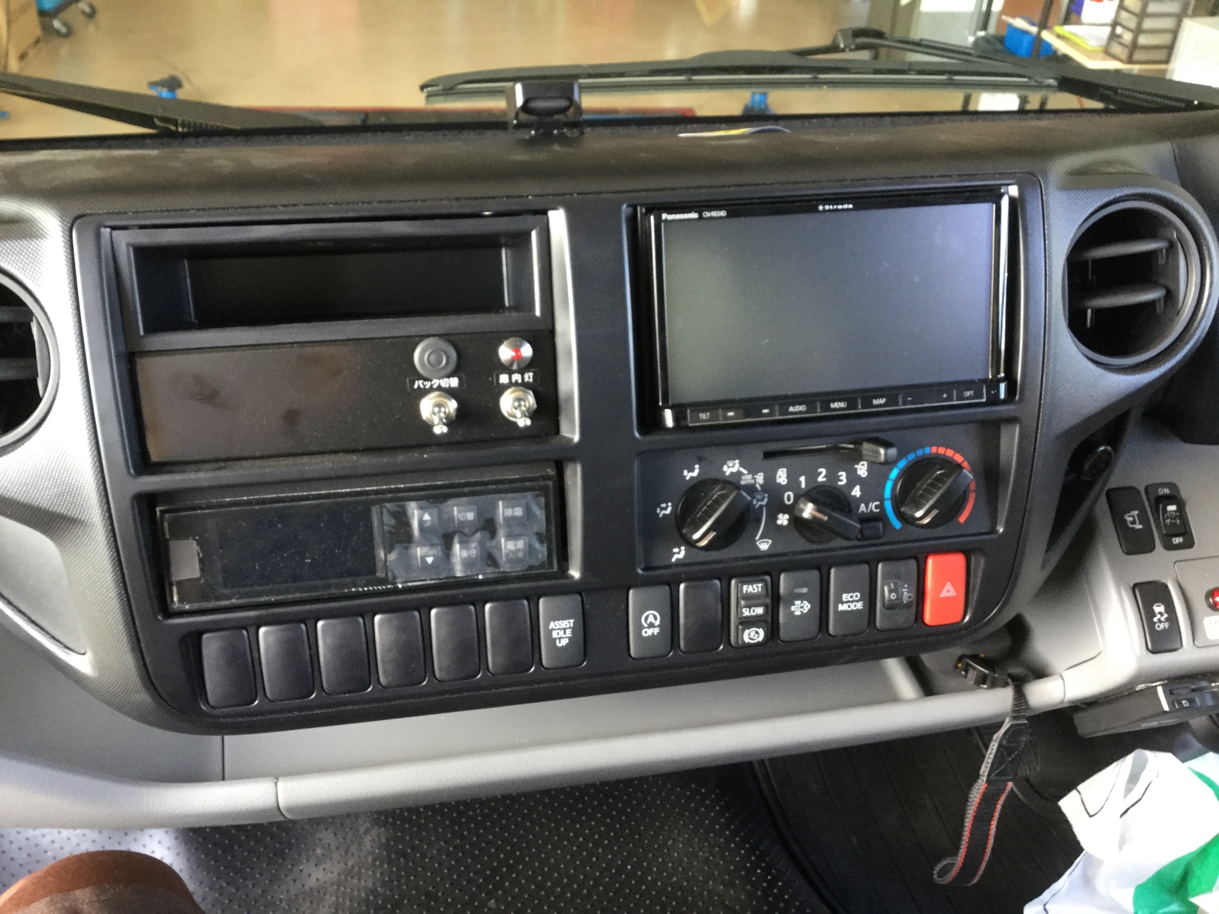 ナビゲーション取付け ポスト 2018年5月14日 今回は、日野デュトロにナビ取付けです。 私自身、かんたん簡単!と思っていたら、落とし穴!! 中型トラックなので、電源が24vなのです。(私のうっかりミス) デコデコ(24v→12v変換)を取付けて、ナビ起動! 無事に取付け完了! 後は、トラック運転手には必要な ドライブレコーダー取付け! 当店では、ナビゲーションの他にも、ドライブレコーダーなども取り扱いしております。 一度、当店へお越しください。 担当:磯