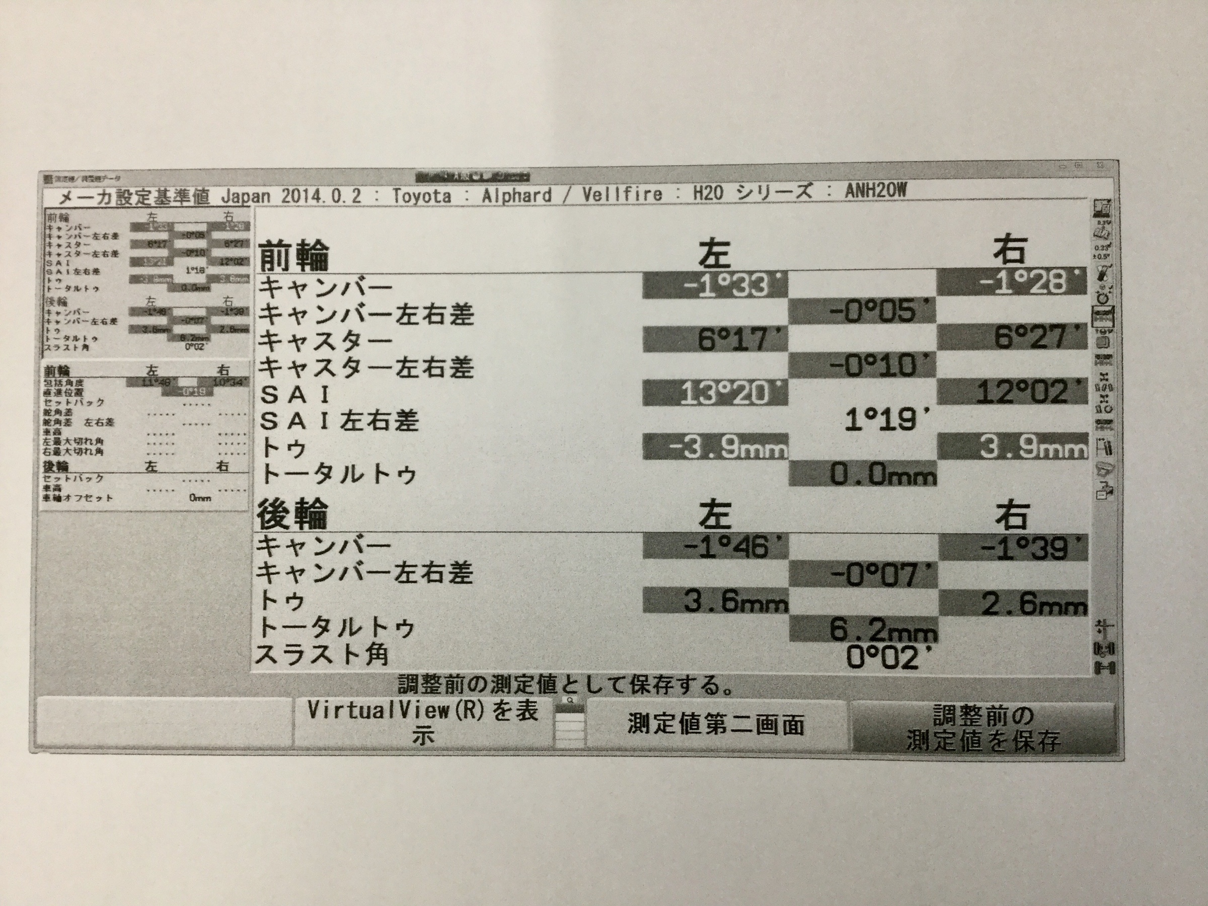 アライメント調整! ポスト 2018年7月26日 こんにちは、タイヤ館こせ店です。 今日ヴェルファイアのアライメント調整をさせていただきました! センサーを慎重に取り付け、測定の準備をしました。 調整前の写真です。 ズレている所をしっかりと調整しました。 調整後の写真です。 最後に締め付けの確認をして作業終了です。 当店では、アライメントの測定だけでもしておりますのでお気軽にお立ち寄りください。