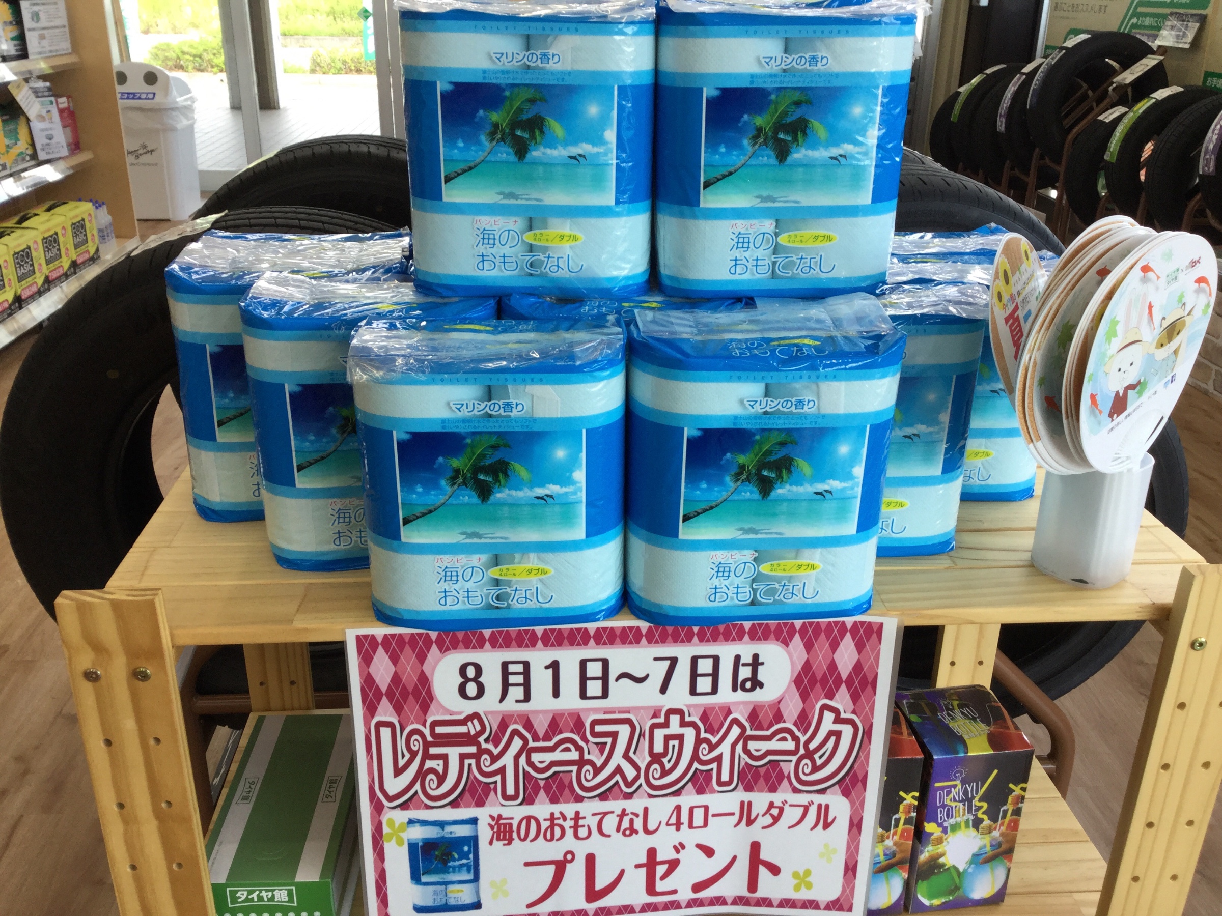 明日よりレディースウィーク♪♪ ポスト 2018年7月31日 こんにちは! タイヤ館こせ店の白井ですʕ•ᴥ•ʔ 今日で7月も終わり、明日から8月ですね☆ これから夏本番.. なかなか厳しい暑さです.. 8月のレディースウィークは 海のおもてなし4ロール ダブルトイレットペーパー 夏らしいマリンの香り♪ ご来店し商品ご購入の女性のお客様に プレゼント致します(๑˃̵ᴗ˂̵) オイル交換時期のお客様は お早めにご来店下さいね! 担当:白井ʕ•ᴥ•ʔ