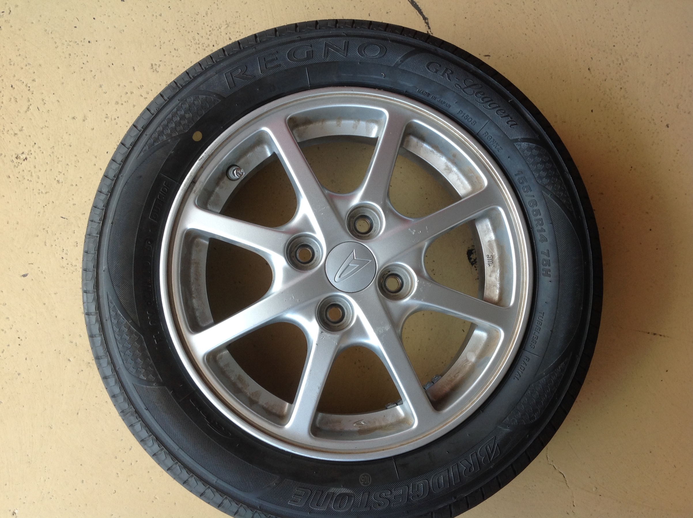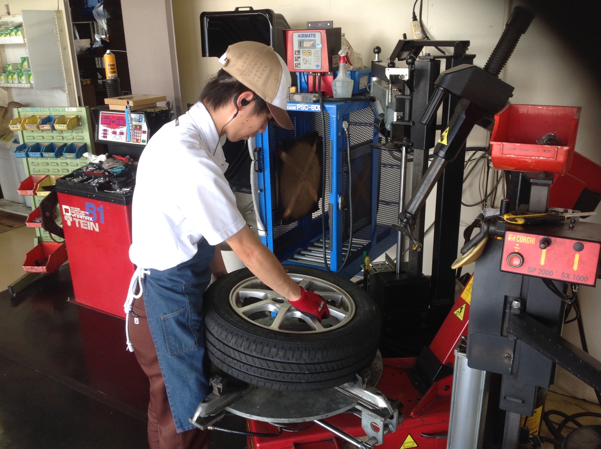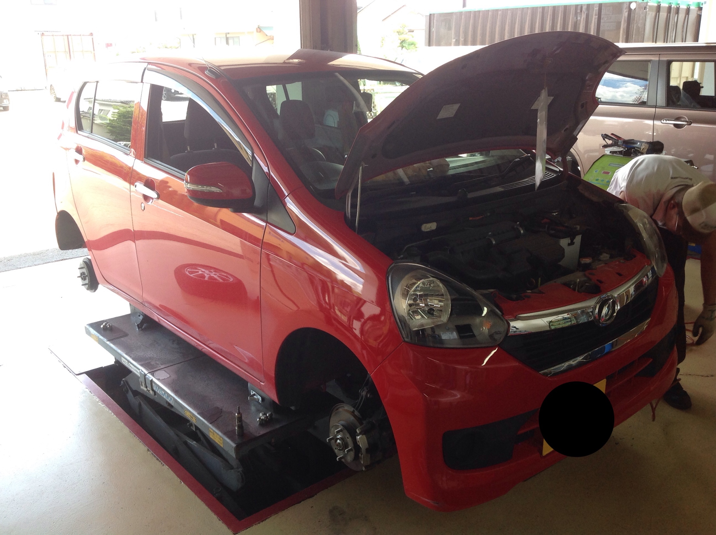 ご予約いただきましたミライース新品タイヤ、アライメントをやらせていただきます。