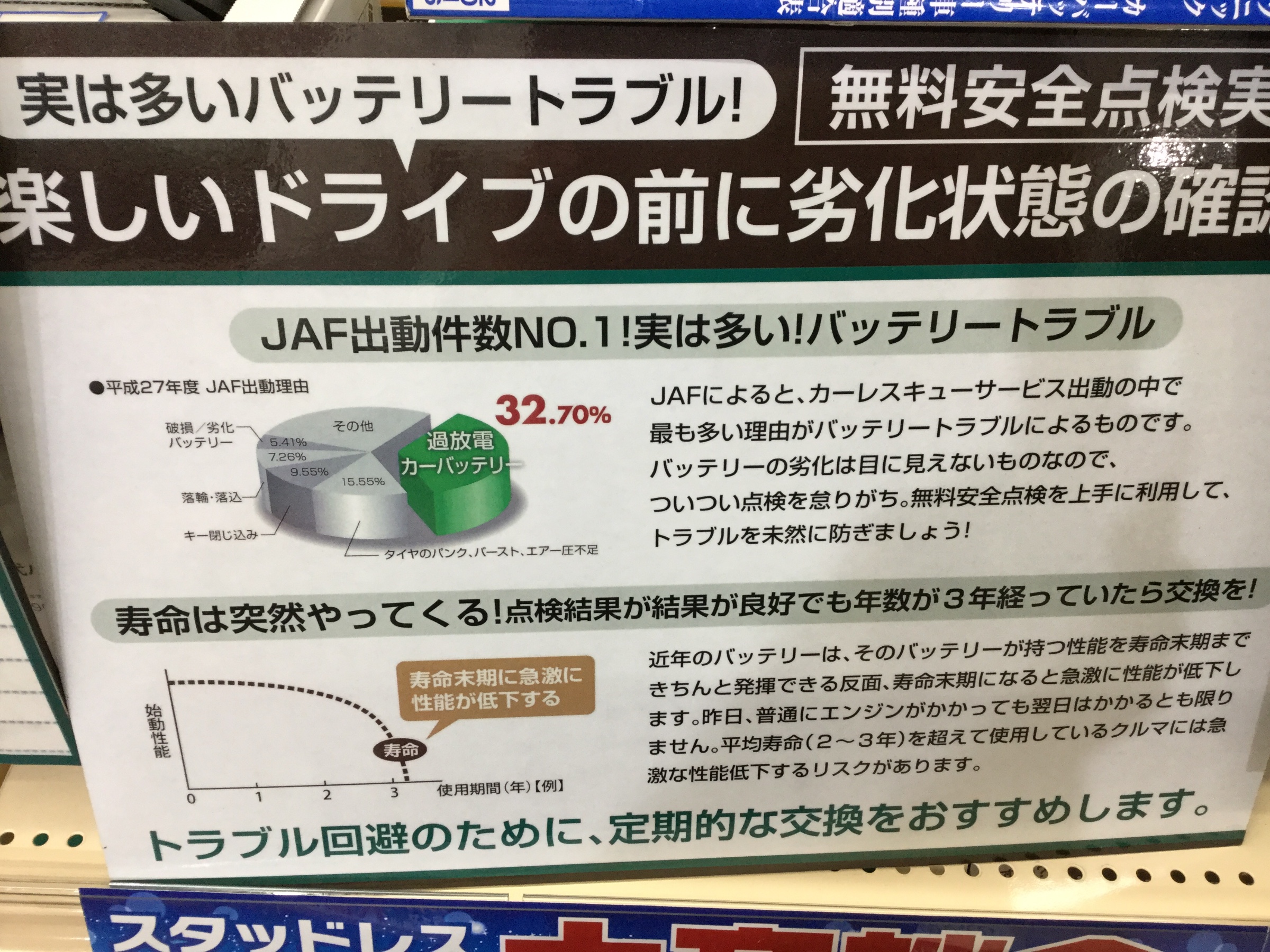 バッテリーの交換は最近されましたでしょうか。 ポスト 2018年10月22日 朝晩も寒くなってまいりましたが、寒くなると多いのがバッテリー上がりですがJAFの出動件数1位がバッテリー上がりです。 今の車は性能がいいのでバッテリーも性能が良くなっているので電圧が急激に低下してしまいます。 寿命としては2から3年ですそれを超えると性能が急激に低下する危険があります。 当店では無料点検を実施していますのでよろしければ、お近くにお寄りの際にはよろしくお願いします。 担当:スタッフ清水