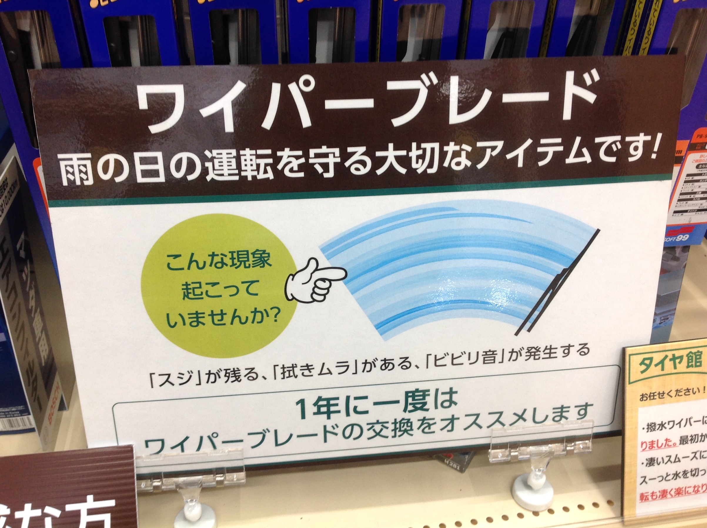 ワイパー交換いつしましたか? ポスト 2019年2月27日 使用条件によっても変わってくるのですが、ワイパーの交換の目安は一年と言われています。 最近雨の日にワイパーの拭き取りが悪く、雨の日の夜前が見にくくなっていませんか? 拭き残しがある方など一度点検をオススメします。 無料点検点検をておりますので気軽にお立ち寄りください。 ワイパーの他にもメンテナンス用品も揃えておりますので、ご来店お待ちしております。 担当:清水