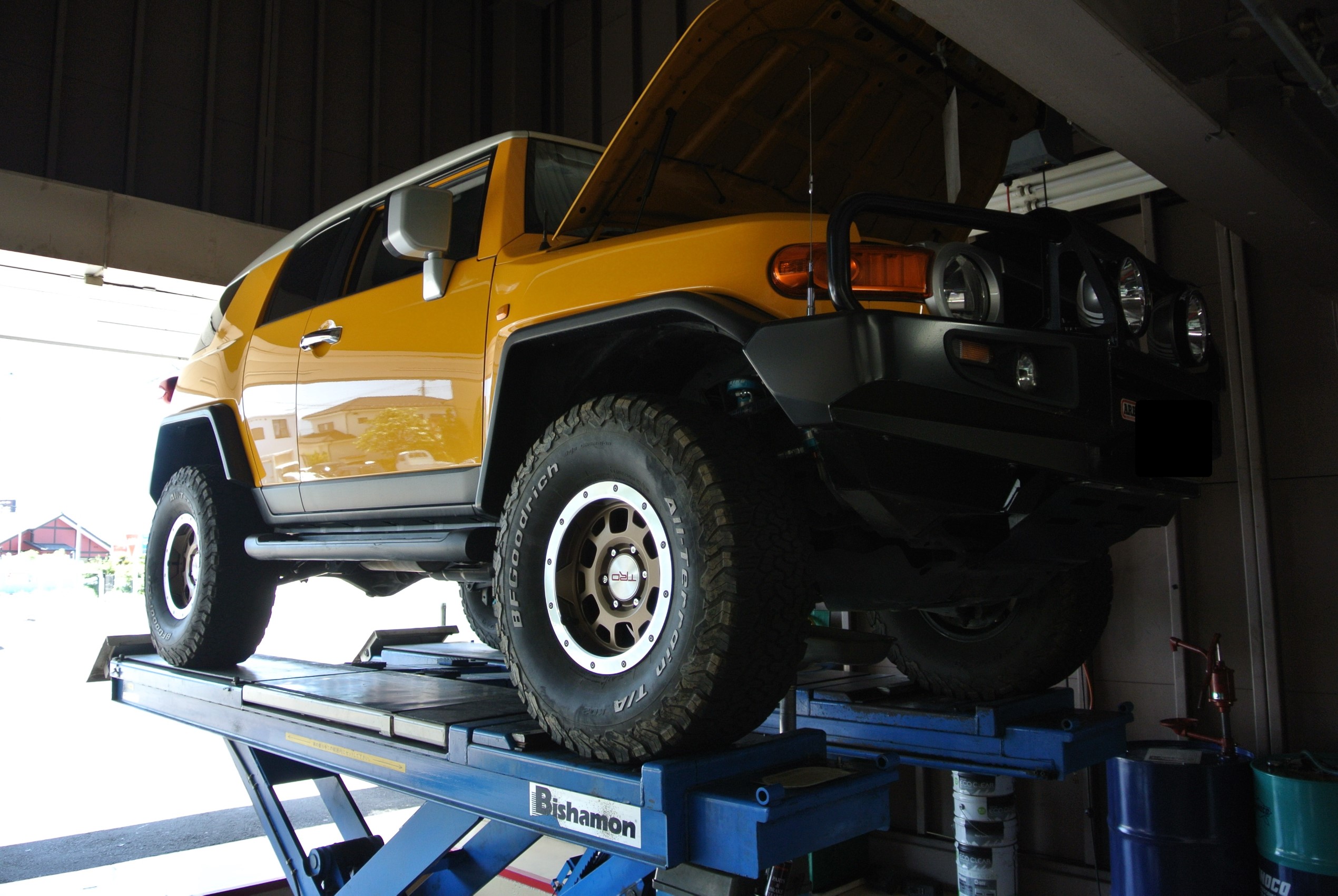 FJクルーザー エンジンオイル交換 ワコーズ トリプルR注入 ポスト 2019年5月25日 本日もタイヤ館こせ店は元気に営業中♪ トヨタ FJクルーザーのオイル交換作業の紹介です。 大柄なボディは当店のリフトでも幅はギリギリですね! 今回はオイルと合わせてフィルターも交換しました。 今回注入しますのはワコーズのエンジンオイル、トリプルRになります。 やや緑がかった色が特徴的ですね! 担当:西田