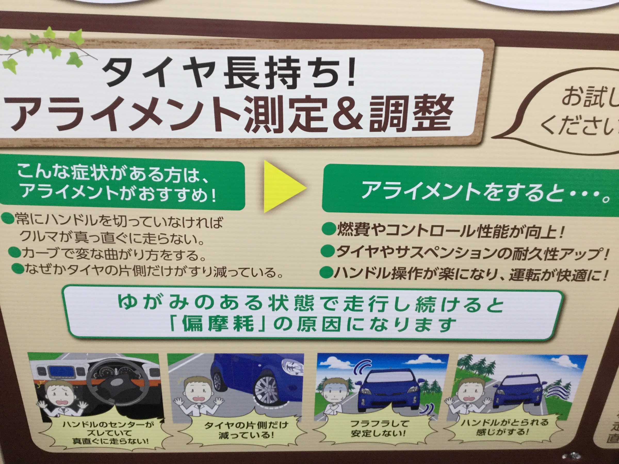アライメント ポスト 2019年6月8日 アライメント調整はご存知ですか? 車を長く使用していると縁石にぶつかってしまったりしますよね? そのダメージは車に残り、タイヤが偏摩耗してしまうことがあります。 タイヤの角度がズレてしまうとタイヤの寿命は早まってしまったり ブレーキの性能が低下してしまうことがあるんです! そこでおすすめなのがアライメント調整です! 詳しくは当店スタッフへお問い合わせください! 担当:星野