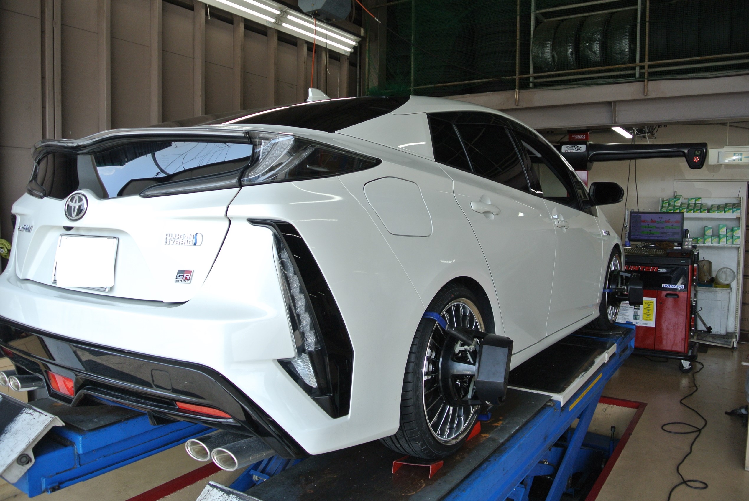 車高調を装着したということでプリウスPHVのアライメント調整を行いました。