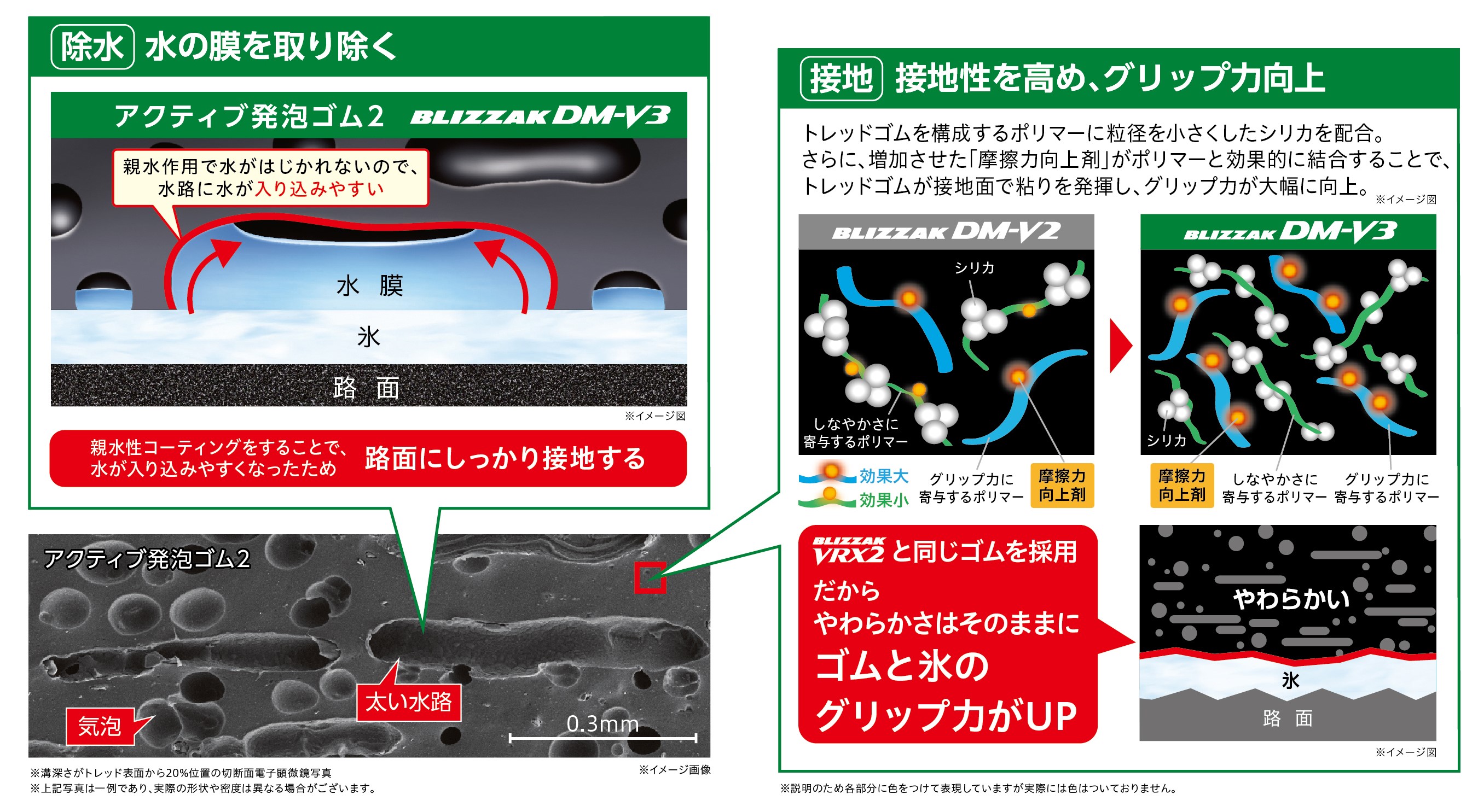 水路の表面を親水性素材(ものの表面に水が薄く広がる性質を持った素材)でコーティングし、気泡の内壁に沿って水を入り込みやすくすることで、タイヤが滑る原因となる路面の水膜を積極的に除去する「アクティブ発泡ゴム」。「BLIZZAK DM-V3」は、それをさらに進化させた「アクティブ発泡ゴム2」を搭載しています。粒径の小さいシリカと「摩擦力向上剤」の配合により、トレッドゴムが氷路面にしっかりと接地し、グリップ力を大幅に向上させました。