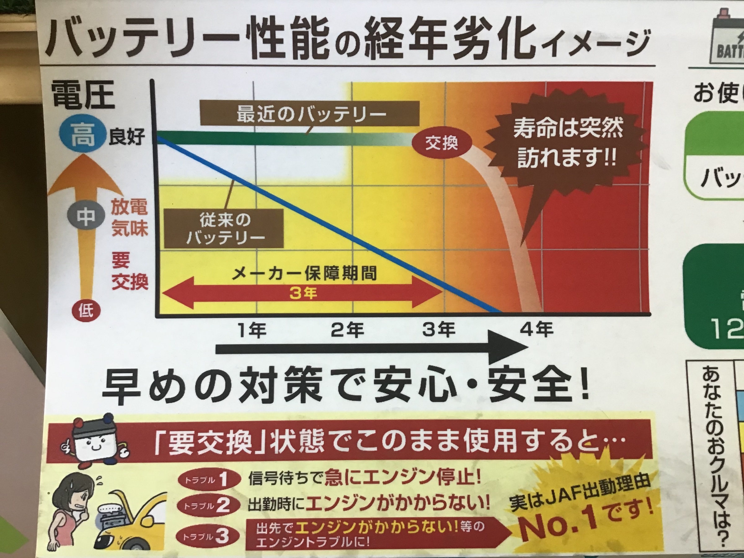 当店では、3年以上経過したバッテリーの点検をおススメしています。