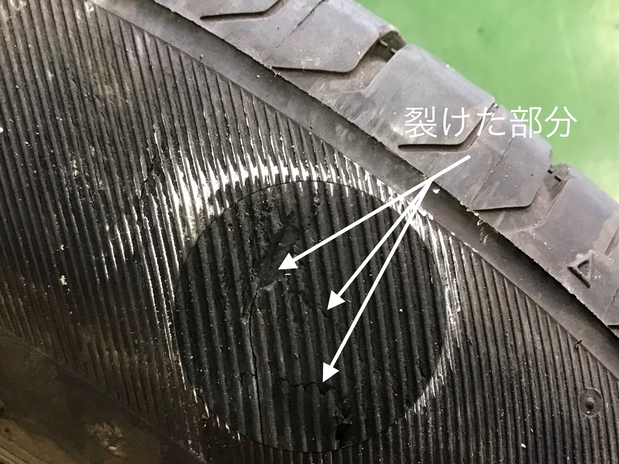 タイヤを激しくヒットさせた事により、裂けているのがわかります。
