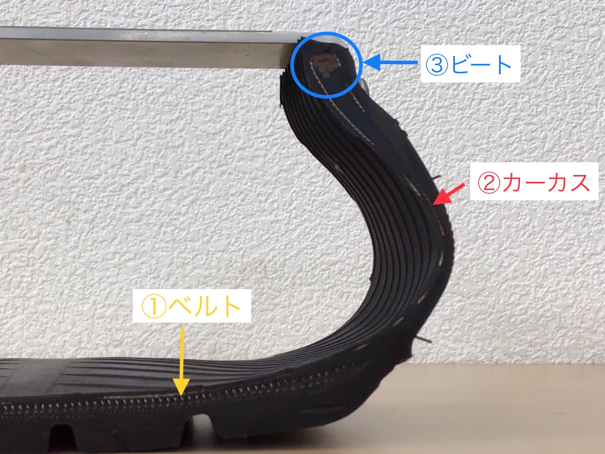 ③ビート:カーカスの固定をし、タイヤをホイールのリムに固定させる