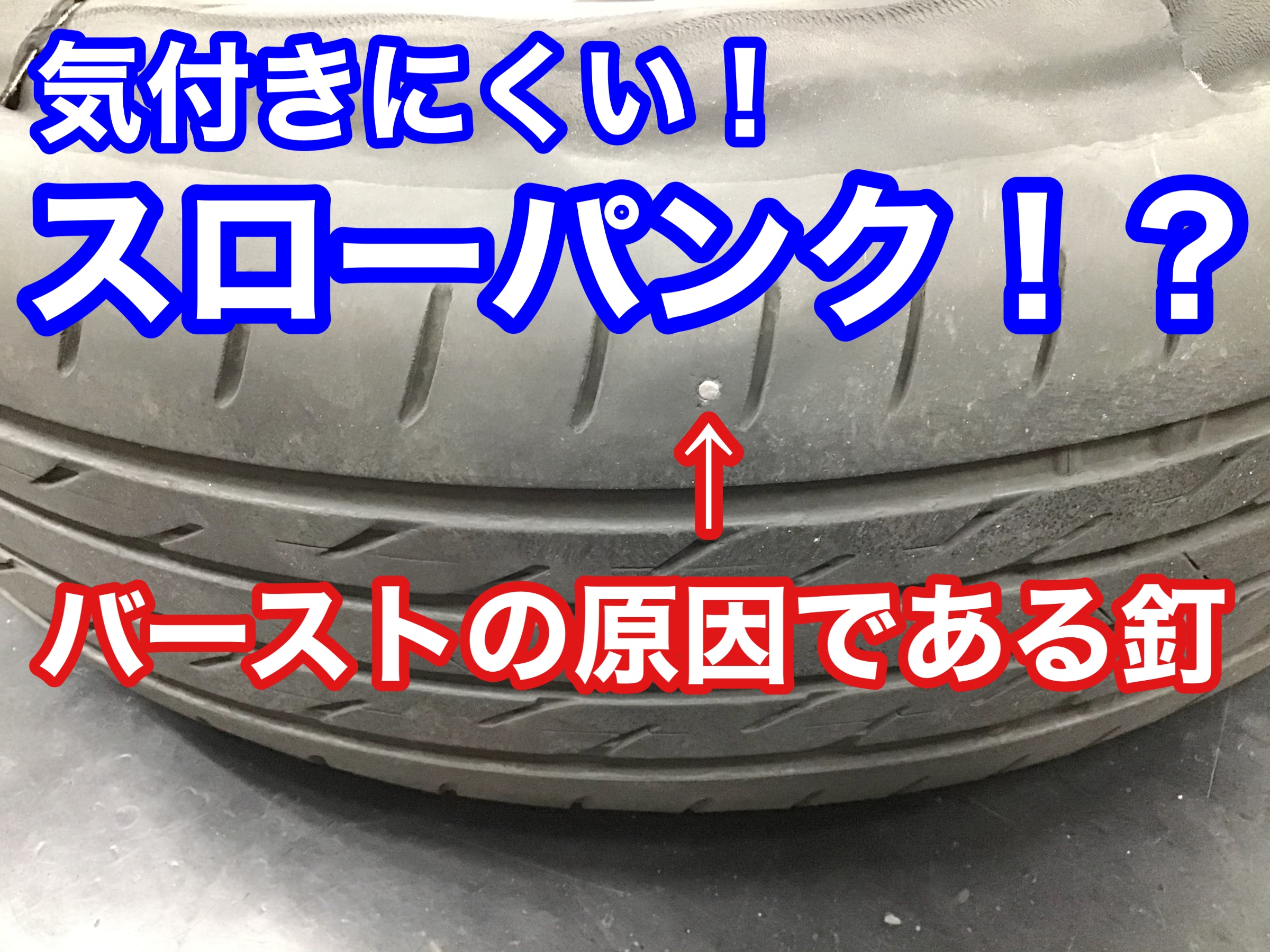 スローパンクとは、異物が小さかったりパンク箇所からのエア漏れが微量すぎて空気が少なくなっていることに気づきにくいことです。少しずつ空気が抜けていることに気づかずそのまま走行していると徐々にタイヤがたわみ始め、タイヤの一番薄い部分(側面)が擦れてしまい耐えきれずバーストへと繋がります。。